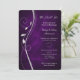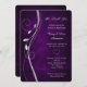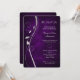 Esta hermosa invitación boda de renovación en tonos plata y morado tiene un elegante remolino de plata adornado con algunas hojas. Tu texto está en plata a la derecha de la imagen. Todo está colocado sobre un fondo de gradiente morado oscuro y profundo que parece casi resplandecer. La parte posterior de la invitación tiene el mismo fondo de degradado morado. Elegante para cualquier temporada!