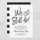 Una divertida y única invitación con letras diseñadas específicamente para su fiesta de aniversario o renovación de votos de matrimonio. Cuenta con las palabras "Aún lo hacemos" con anillos de boda descansando encima. Debajo de esto hay espacio para los detalles de su fiesta o evento único. En el reverso hay rayas negras y blancas elegantes para complementar la parte delantera.