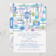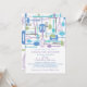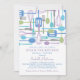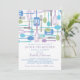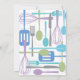 En esta encantadora invitación a una ducha nupcial para la futura novia, se incluyen utensilios de cocina y comida de estilo retro. La combinación de colores es divertida y neutra con tenedores, cucharas, cuchillos, espátulas y susurros en tonos fríos de color violeta, turquesa, azul, verde y carbón vegetal. todo ello sobre un fondo blanco nítido.