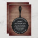 Ilustracion de una sartén de hierro fundido con texto blanco sobre un fondo rústico de madera.