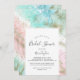 Esta invitación abstracta a la ducha con colcha de agua de verano es perfecta para una moderna ducha de boda. El diseño es elegante y exclusivo, con una acuarela azul claro, verde menta, rosa y púrpura pastel con toques de purpurina dorado, creando un ambiente de playa impresionante.