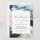 Esta abstracta invitación a la boda celestial es perfecta para un boda moderno. La decoración es elegante y sobria, con una acuarela azul marino oscuro y rosa y salpicaduras de purpurina dorado, creando un espacio exterior y el cielo nocturno.