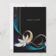 Esta imagen presenta un diseño abstracto elegante y moderno. El diseño se centra alrededor de un marco hexagonal oscuro con un contorno dorado, situado sobre un fondo oscuro. Los elementos flotantes, parecidos a cintas, en tonos verde azulados, blancos y dorados rodean con gracia el marco, lo que añade un sentido de movimiento y sofisticación. Una flor blanca con acentos dorados añade un toque de belleza natural a la composición, por lo demás abstracta. El conjunto es de elegancia refinada, con una estética contemporánea que mezcla elementos orgánicos y geométricos. Este diseño sería adecuado para un boda elegante y moderno, posiblemente con una combinación de colores centrada en los tonos oscuros, verde azulados y dorados. Personalice el texto relativo a los nombres y detalles del boda. Puedes descargar la tarjeta en tu equipo móvil o computadora.