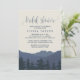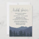 Este retiro a la tarjeta de invitación a la ducha de novias de las montañas es perfecto para una moderna ducha de novia. El diseño cuenta con una serena cordillera de color azul con un bosque de árboles verdes en primer plano.