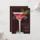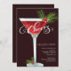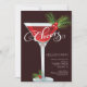 ¡ALEGRÍAS de la diversión! La invitación retra del cóctel del día de fiesta que ofrece un vidrio rojo de martini con un agitador rojo y blanco del bastón de caramelo de la raya y un acebo hojean con las bayas en el tronco.