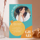 ¡Acércate y celebra! Nuestras modernas y elegantes invitaciones para boho son la manera perfecta de anunciar su graduación con estilo. Con un audaz tipo de letra con formas editables de color azul verde azulado, mostaza y terracota, añada 5 de sus fotos favoritas. invite a su invitado a su casa abierta y anuncie su graduación con estilo.