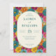 This is a floral style image featuring an elegant wedding invitation surrounded by a vibrant array of colorful flowers. The background bursts with shades of pink, orange, yellow, and teal, creating a lively and cheerful atmosphere. At the center, an oval frame in soft green holds all the essential details about Lauren and Benjamin's special day, including the date, time, and location. The overall mood is warm and inviting, perfect for setting the tone for a joyous celebration filled with love and happiness.