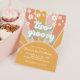 dos Invitación de cumpleaños Groovy Retro Sunshine inspirada en la primera con margaritas al estilo de los 70 y fuentes y colores boho.