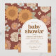 Invite a amigos y familiares a compartir la alegría de la llegada de su pequeña con esta invitación a la ducha de bebé, con flores retro sobre un fondo marrón.