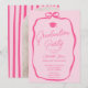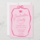 A retro Hot pink and pastel pink graduation layout with a soft hand drawn coquette-inspired ribbon frame and elegant script typography. The front features a refined invitation design with a bow detail, while the reverse side highlights a full photo framed by bold vertical stripes for a stylish, fashion-forward look.