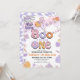 Chica de Invitación de Primer Cumpleaños Retro Purple Pequeño Boo Halloween con tema de Halloween, invitación de primer cumpleaños para una niña que presenta un fantasma groovy, calabazas, escoria, murciélagos, cobardes y globos. Esta invitación de Halloween para el primer cumpleaños también incluye un texto multicolor de estilo retro y un patrón de tablero de ajedrez en la parte posterior. Una fiesta de primer cumpleaños divertida en octubre o Halloween para una niña.