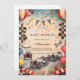 A whimsical vintage design featuring classic race cars, checkered flags, and colorful balloons set against a hand-painted carnival backdrop. The artwork blends nostalgic charm with playful details, perfect for celebrating in a cheerful, storybook-inspired style. Ideal for themes that capture motion, adventure, and timeless joy.