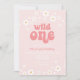 ¡Salvaje! Invitación de primer cumpleaños inspirada en el retro con daisies de estilo de los años 70 y fuentes y colores boho.