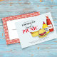 Este diseño cuenta con una barbacoa, barbacoa o una invitación a barbacoa, perfecta para el verano, con un tema casual, picnic, reuniones familiares, Ideal para eventos en el patio trasero y al aire libre, con gingham roja y blanca, hamburguesa y hotdog
