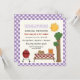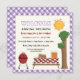 Invitación a la reunión anual de la familia de picnic con barbacoa con gingham morada o frontera vichy con una mesa de lo más original con manteles y hamburguesas a cuadros, ensalada de patatas, sandía y jugo de naranja, parrilla de barbacoa de gas rojo, un árbol y el sol. Ideal para un picnic de verano. Elementos de arte de Alice Smith.