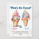 Invitación a la fiesta de examen de género con crema de hielo Cuto y género moderno y a la moda revelan la carta de invitación a la fiesta con un ilustracion acuarela de helados en cono de gofre en rosa y azul con salpicaduras de helado dorado. El texto dice "¿Cuál es la primicia? ¿Niño o Chica?" Perfecto para el sexo revela fiesta en el verano.
