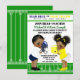Invitaciones de revelación de género de fútbol con adorables bebé niño y bebé niña afroamericanos étnicos que visten lindos trajes de fútbol azul y amarillo en un fondo de campo de fútbol. Puede personalizar fácilmente esta invitación de revelación de género de fútbol para su evento simplemente agregando sus detalles.