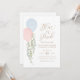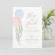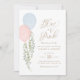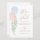 Invite a amigos y familiares a su revelación de género con esta elegante invitación, que incluye dos globos acuáticos y eucalipto con tipografía dorada.