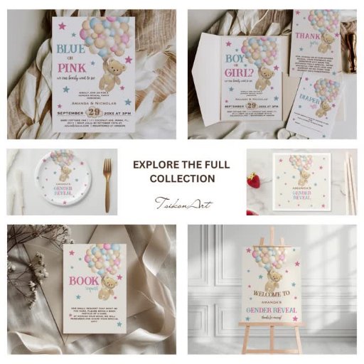 Esta minimalista acuarela moderna de los globos beige rosado Teddy Bear te invita a descubrir el género, con el niño más dulce y los osos chicas sosteniendo globos rosas y azules y alrededor de las estrellas azules rosas. Esta colección de revelaciones de género es una mezcla de temas minimalistas, rústicos y boho. No te olvides de descubrir la colección completa.