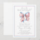Él o Ella, ¿Cómo será el bebé? Únase a los emocionados padres para descubrir el sexo de su bebé con esta encantadora invitación a la fiesta de revelación de género. El diseño presenta un delicado lazo de acuarela en tonos suaves de rosa y azul de bebé, enmarcado por bordes rosados y azules que añaden un toque de color a los bordes. La elegante mezcla de tipografía serif gris y escritura complementa perfectamente el tema clásico, lo que la convierte en una forma ideal de celebrar a los futuros padres. Puede personalizar los colores de la fuente y cambiar el fondo frontal para que coincida con sus preferencias, mientras que la parte posterior permanece simple para mantener la elegancia delicada y atemporal del diseño. Invitación a la fiesta de revelación de género con lazo rosa y azul, tipografía de escritura elegante y acuarela bonita.
