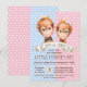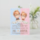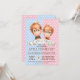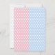 Invitaciones de revelación de sexo de mono con adorables monos orangutanes bebé niño y niña en acuarela sobre un fondo de puntos rosas y azules. Estas invitaciones de revelación de sexo de mono se personalizan fácilmente para su evento simplemente agregando sus detalles. Puede mover o eliminar la corbata de lazo.