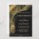 Rica y elegante textura de pepitas de oro sobre un velo amarillo dorado. El diseño es negro y dorado con un texto claro dorado/marrón claro. Una botella de champán en un cubo de hielo añade un encantador toque festivo a su evento.