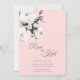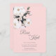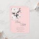 Delicadas rosas blancas en la esquina superior izquierda de esta elegante y minilalista invitación a bodas de color rosa. Detalles de la invitación a la boda en tipografía gris.