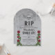 Cumple 40 años en una elegancia oscura y elegante con esta invitación a la fiesta de la cosecha gótica de la grava de la vida única. Esta invitación en forma de arco se asemeja a una piedra de cabeza, con un cráneo con emblema de alas, rosas, espinas y una textura de piedra gris acuarela.