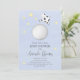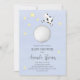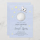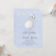 Este diseño presenta un guión caprichoso lindo y caprichoso de género, con URL de la tienda de códigos QR, con medios sociales página web de fiestas de eventos en Facebook, con una vaca saltada sobre el tema de la luna, un guión elegante de caligrafía, con una elegante invitación a la ducha de diseño, y un cielo azul y estrellas amarillas luna, un clásico ritmo de guardería tradicional, una plantilla de postales amigable, para ser mamá