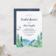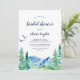 Esta invitación a la ducha de novia de Rocky Mountain es perfecta para una ducha exterior de matrimonio. El diseño presenta un paisaje natural pintado de azul y verde con pinos acuarelas, pájaros y montañas.