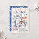 Invitación al primer cumpleaños del Rodeo Rojo Rojo Bronco Azul de la Viñeta Invitación del Niño azul y rojo de primer cumpleaños con un paisaje desértico, vaquero y caballo, estilo de cuerda y otro tipo de letra de estilo occidental.