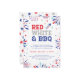 Celebre el cumpleaños de América con estilo con esta invitación de fiesta de barbacoa del 4 de julio con el texto "ROJO, BLANCO Y BARBACOA" y decorado con un pequeño cohete, fuegos artificiales patrióticos y pequeñas estrellas.