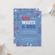 Celebre el cumpleaños de América con esta invitación para una fiesta de BBQ del 4 de julio que incluye la frase "ROJO, BLANCO & BBQ" y decorada con un pequeño cohete, fuegos artificiales patrióticos y pequeñas estrellas sobre un fondo gris azulado.