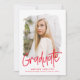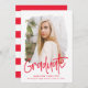 Invitaciones de fiesta de graduación a la moda mostrando la foto del graduado dentro de un marco de máscara texturizada con "Graduado" en un guión escrito a mano en rojo. Personalice la parte delantera de la fiesta de graduación con fotos agregando el nombre del graduado, el nombre de la escuela y el año de graduación. La invitación se invierte para mostrar los detalles de tu fiesta de graduación con un patrón rayado rojo y blanco.