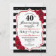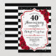Invitación de fiesta de aniversario de bodas número 40 Rojo Rubí. Tarjeta de invitación elegante roja, negra y blanca con brillo plateado falso. Cuenta con rayas negras y blancas elegantes, fuente de escritura y rosas rojas. Perfecto para una celebración de aniversario número 40.