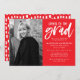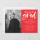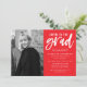 Invite a los invitados a celebrar el graduado con nuestras invitaciones a la fiesta de graduación de "Cheers to the Grad". La moderna fiesta de graduación invita a presentar la foto vertical del graduado a la izquierda. "Saludos al grado" se muestra en un guión blanco con letras a mano con fondo rojo. Personalice la parte delantera de la invitación añadiendo el nombre del graduado, el nombre de la escuela, el año de graduación y los detalles del fiesta. La invitación se invierte para mostrar un patrón de puntos abstractos rojo y blanco.