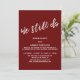 Aquí tienes una opción moderna y sencilla para tus necesidades de celebración de aniversario de boda. Sobre un fondo rojo oscuro (el color se puede cambiar a cualquier otro que prefieras), he colocado un gráfico de tipografía blanca que dice "we still do". El gráfico se creó utilizando una fuente de escritura a mano moderna y casual. Utiliza los campos de plantilla para agregar tus propios detalles y haz clic para personalizar aún más si deseas realizar alguna modificación adicional. Todas las capas están desbloqueadas para permitir todo el control de posicionamiento y tamaño que desees.