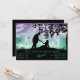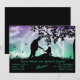 Silueta romántica de una pareja bajo un árbol con luna llena al fondo y algunas mariposas. El fondo es un cielo morado y verde estrellado y nublado. Ideal para un anuncio de fuga o fiesta de compromiso.