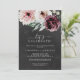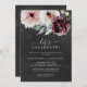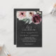 Esta florida gris romántica celebremos la invitación es perfecta para una elegante fiesta de compromiso, boda tras fiesta, retiro, graduación o cualquier evento feliz. El moderno diseño rústico de boho cuenta con románticas flores acuáticas en tonos suaves de burdeos, malva, rosa y crema blanca con hojas verdes.