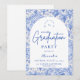 An elegant graduation celebration design featuring a delicate blue toile floral border inspired by classic European porcelain and vintage botanical prints. The intricate florals frame a clean arched center panel, creating a refined and timeless composition that highlights the graduate’s name and event details beautifully. Soft blue tones against a crisp ivory background give the design a sophisticated yet celebratory feel. Perfect for a stylish graduation gathering with a classic, romantic aesthetic.
