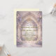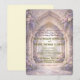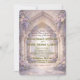 Step into an enchanted garden with lilac hydrangeas, blush roses, and a printed stone archway. Set a romantic fairy-tale mood for your spring ceremony.This formal stationery suite utilizes a carefully balanced visual hierarchy, centering around a vintage gothic stone archway with a printed carved texture that frames a glowing light pathway. Soft digital watercolor botanicals, specifically blush pink roses and lavender purple hydrangeas, cascade organically down the carved stone columns. An ornate hanging chandelier motif introduces a faux gold foil printed effect, which is harmoniously mirrored in the elegant calligraphy script and decorative fantasy serif typography below. The entire composition utilizes a subtle digital glow effect against a cream white and beige neutral background to establish an ethereal atmosphere.This is a flat printed image with a faux gold foil and carved stone effect, not actual raised material.