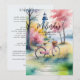 This invitation features a romantic landscape with a lighthouse in the background, viewed from inland and surrounded by trees, foliage, and soft pink vegetation tones. The illustration conveys a warm and feminine atmosphere, with a serene and charming feeling that evokes peaceful walks, nature, and shared moments. The presence of the bicycle adds a sweet and approachable touch, reinforcing the sense of a special weekend enjoyed calmly and joyfully among friends.
