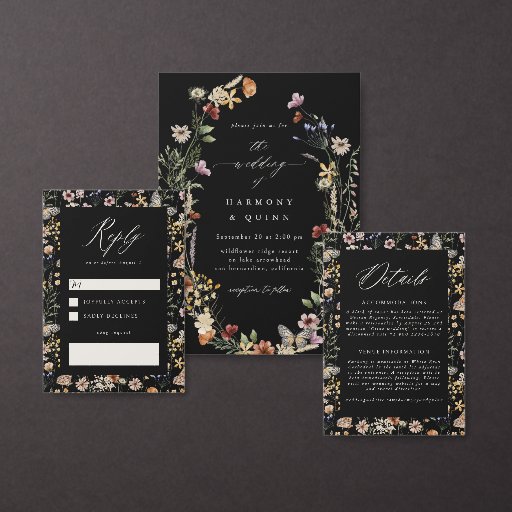 Our wedding invitation card features a hand-painted rustic watercolor bohemian floral frame adorned with butterfly details for the perfect moody, romantic boho vibe.
