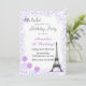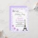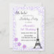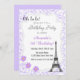 Invitación de cumpleaños con tema de parís y combinación de color púrpura.