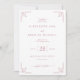Esta elegante invitación de boda presenta un diseño simétrico con un fondo suave de color rosa pálido, creando una atmósfera cálida y acogedora. El diseño incluye motivos geométricos en las esquinas espejados en un tono ligeramente más oscuro de rosa, añadiendo un toque abstracto y sofisticado. El texto centrado está organizado jerárquicamente utilizando fuentes delicadas de escritura y serif, enfatizando los nombres y detalles del evento mientras mantiene un atractivo atemporal. El estilo general combina elementos clásicos y contemporáneos, perfecto para transmitir formalidad y gracia, lo que lo hace ideal para celebrar un momento importante de la vida con calidez y refinamiento.