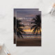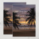 Espectacular puesta de sol en la playa con un cielo dorado y violeta, olas oceánicas tranquilas y una silueta negra de una palmera a la derecha. Los tonos cálidos reflejan el agua, creando un ambiente romántico y sereno, perfecto para una invitación a la boda.