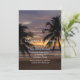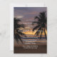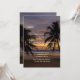 Espectacular puesta de sol en la playa con un cielo dorado y violeta, olas oceánicas tranquilas y una silueta negra de una palmera a la derecha. Los tonos cálidos reflejan el agua, creando un ambiente romántico y sereno, perfecto para una invitación a la boda.