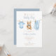 Esta bonita invitación para baby shower presenta ropa de bebé niño azul en una cuerda para tender y se puede personalizar con tus datos en tipografía elegante. Diseñado por Thisisnotme©
