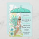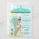 La invitación de la ducha de ropa interior nupcial presenta flores tropicales azul huevo de petirrojo y teal, paraguas y novia rubia por venir. Disponible con cabello rubio, marrón y rojo y piel clara y oscura.