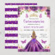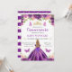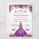 Elegante acuarela princesa de cabello rubio con un diseño de vestido morado profundo con flores moradas y doradas, mariposas y confeti purpurina de oro.